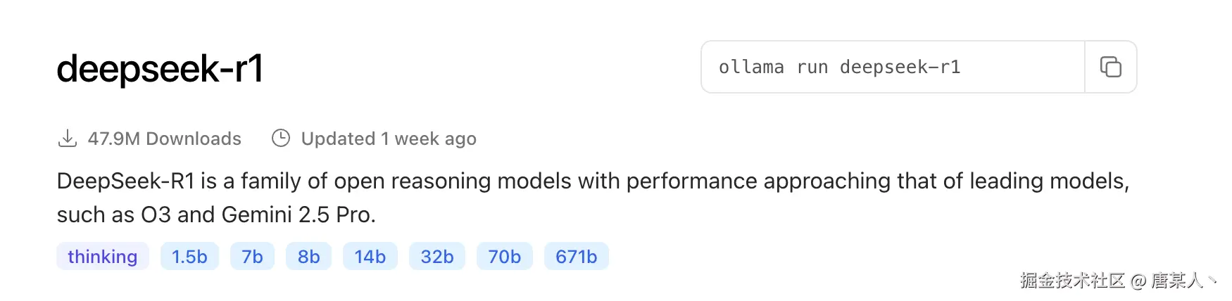 接下来便是挑选合适的大模型。选择一个你喜欢的模型,下载时需注意模型参数大小。如下图的 deepseek 模型,它分别有 1.5b ~ 671b 的参数可以选择。模型参数越大,你下载的参数文件就越大,运行时所需的内存就越大。