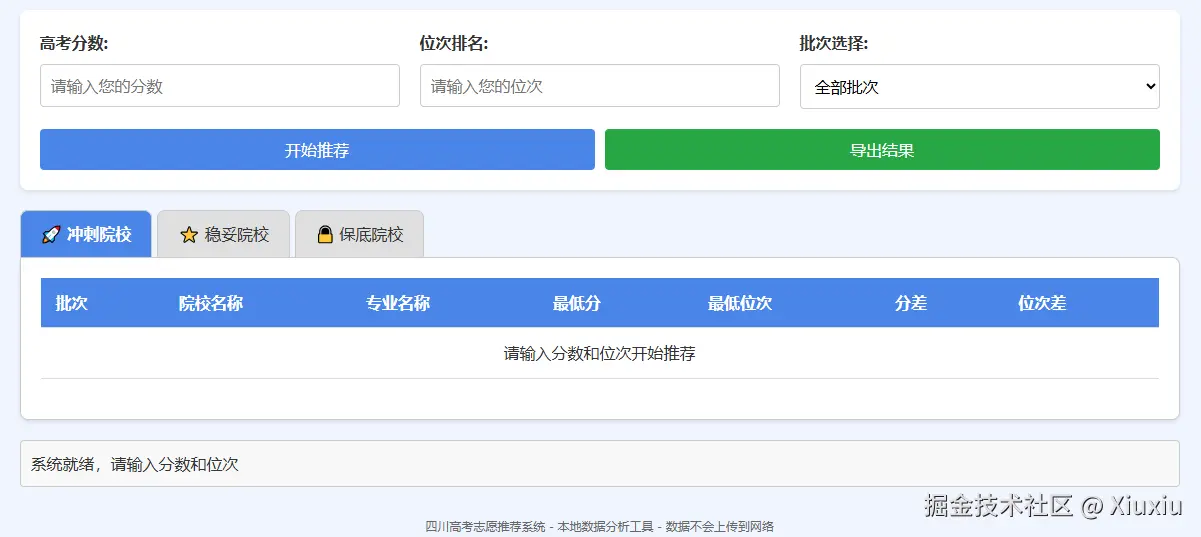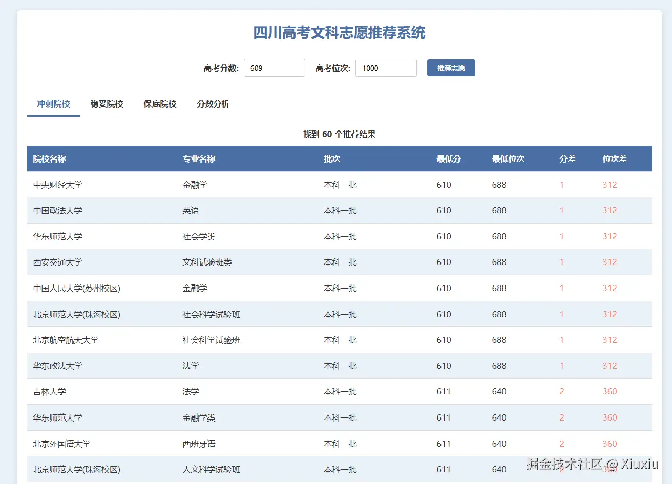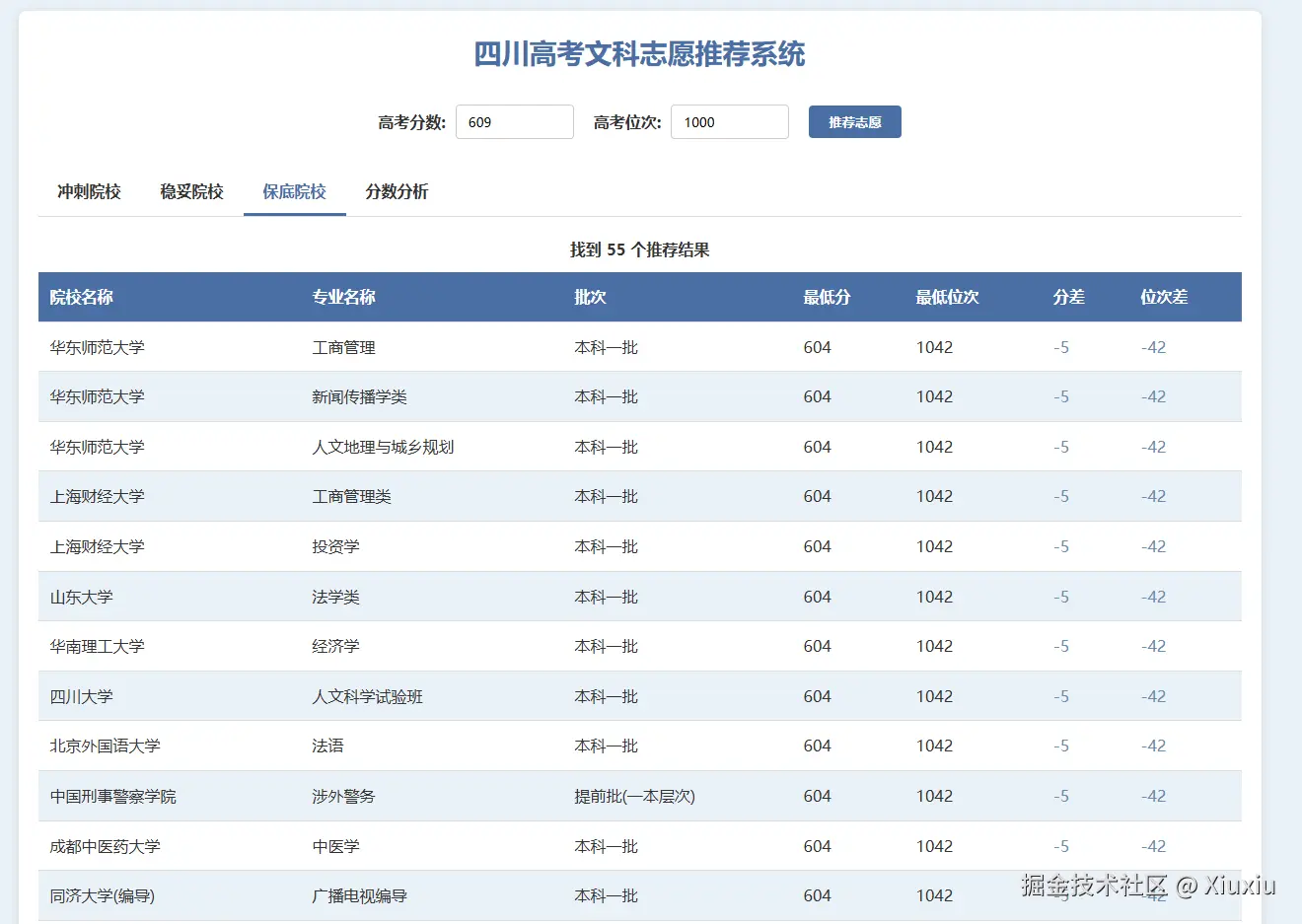 我需要2024年四川文科/理科的批次、院校名称、专业名称、最低分和最低位次的数据。制作一个比较精美的页面程序,可以重复使用;我输入我的分数和位次就可以推荐冲(比我的分数高0-10分,位次高),稳(比我的分数高0-5分的学校,与我的位次相近),保(比我的分数低0-10分,位次低)的学校和专业。配色要求商务简洁。