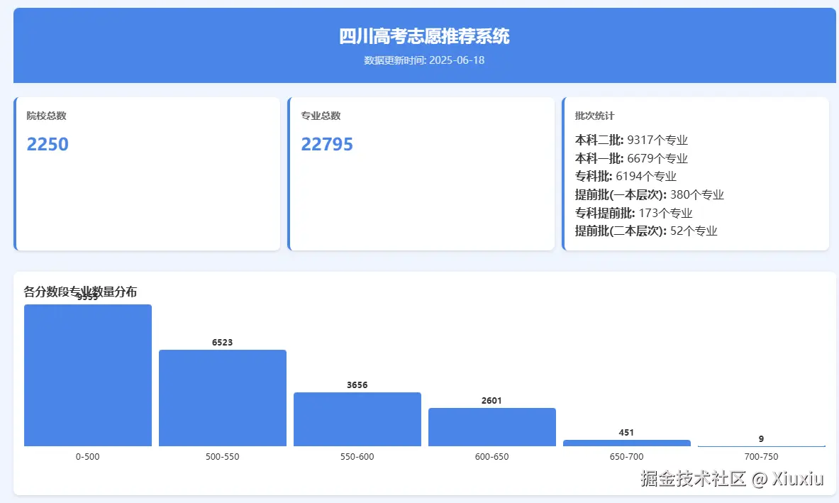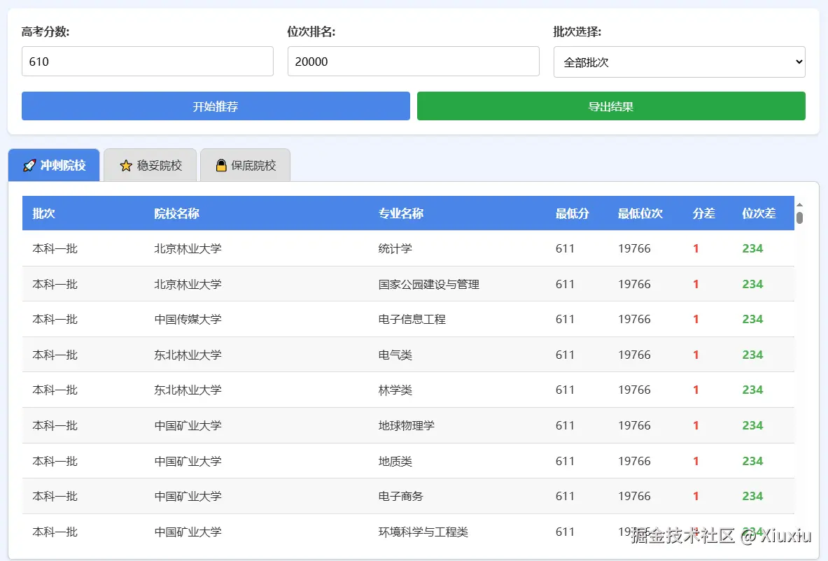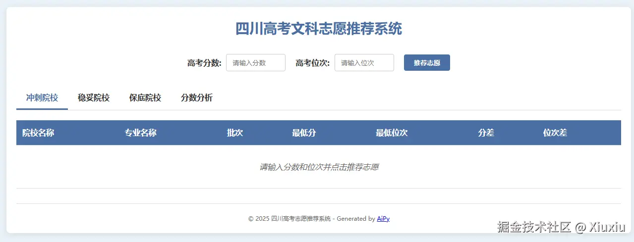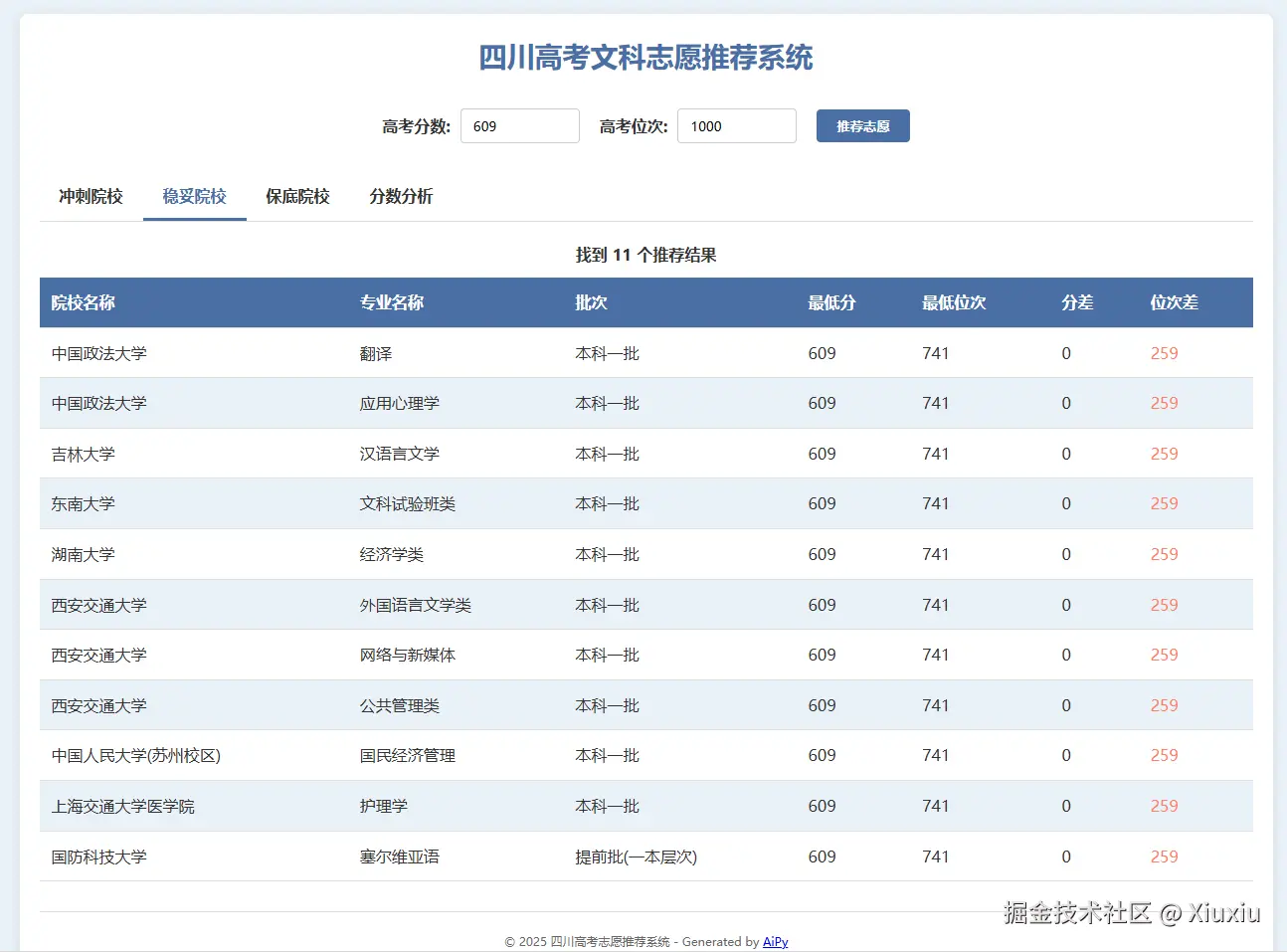 我需要2024年四川文科/理科的批次、院校名称、专业名称、最低分和最低位次的数据。制作一个比较精美的页面程序,可以重复使用;我输入我的分数和位次就可以推荐冲(比我的分数高0-10分,位次高),稳(比我的分数高0-5分的学校,与我的位次相近),保(比我的分数低0-10分,位次低)的学校和专业。配色要求商务简洁。