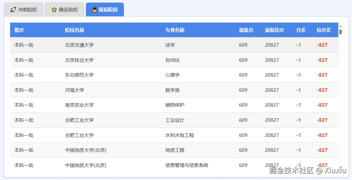 在这里我们以609分,排1000位次为例,给我们展现了冲、稳、保的三个层次学校和对应专业。