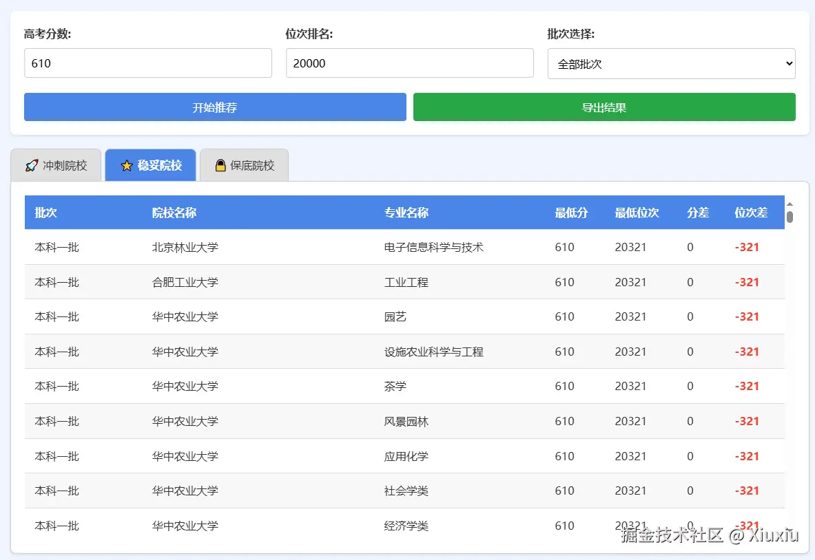 在这里我们以610分,排20000位次为例,给我们展现了冲、稳、保的三个层次学校和对应专业。