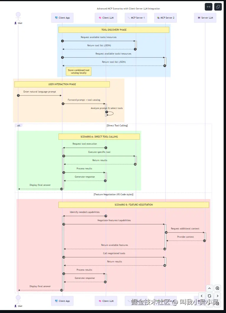 除了基本的 MCP 架构之外,还有一些高级场景,其中客户端和服务器都包含 LLM,从而实现更复杂的交互: