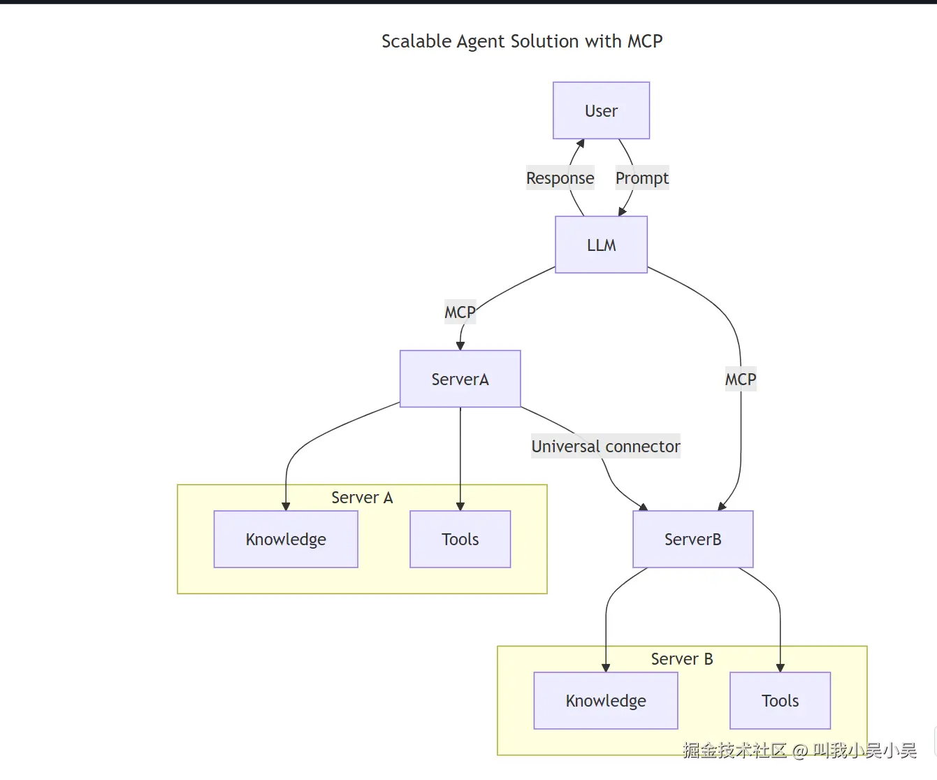 这种简化的集成与美人鱼图中描绘的流程一致,其中服务器提供工具和知识,确保跨系统的无缝协作。