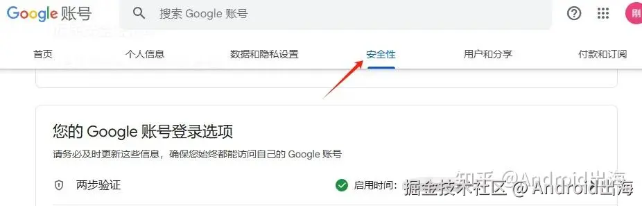 步骤 1: 登录 Google 账号,找到 [安全性] 选项,进而点击进入 [两步验证] 设置页面。在这里,开发者可以正式开启两步验证功能。