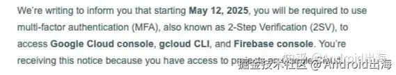 今年,Google Play 明确宣布,自 2025 年 5 月 12 日起,将强制推行两步验证政策,该政策全方位覆盖 Google Play 开发者控制台、应用发布流程、财务操作等各个关键环节。这意味着,届时所有开发者在执行这些操作时,都必须通过两步验证,才能顺利完成相关事务。对于广大出海开发者而言,最佳应对策略是在 2025 年 3 月至 4 月的这段时间内,完成团队全员的账号两步验证配置工作,以免政策正式施行后,因未及时设置而阻碍业务正常开展。