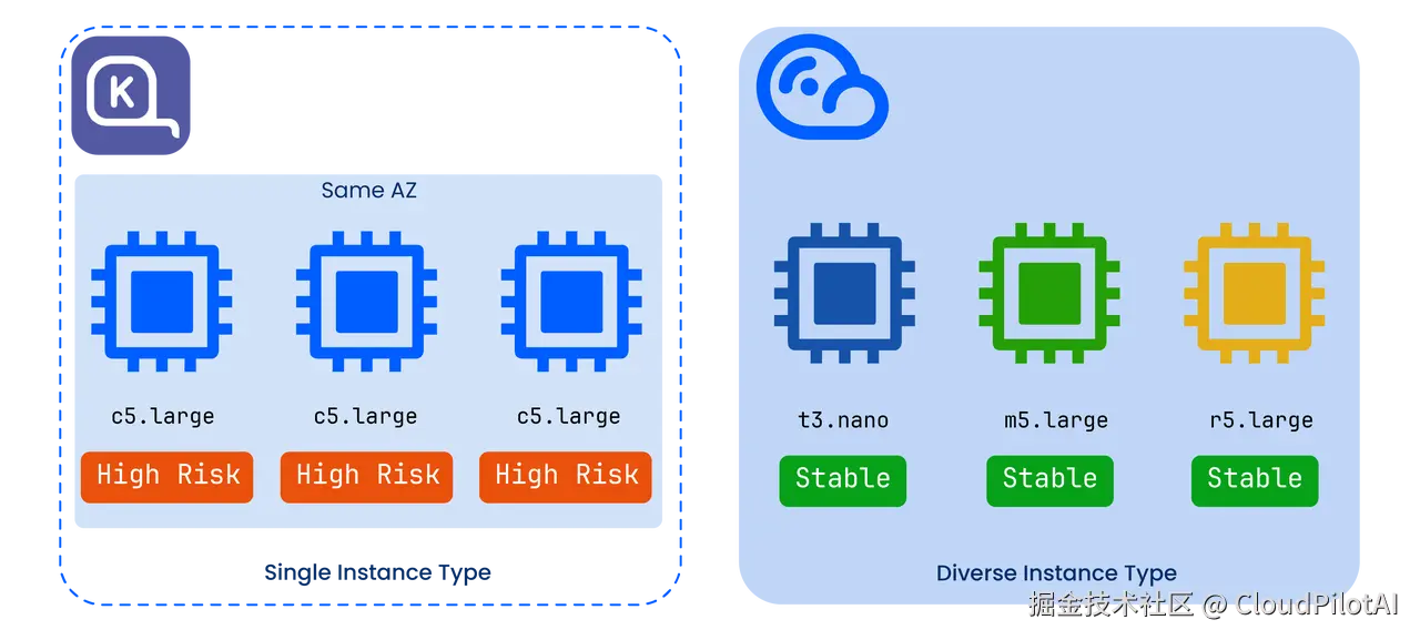 为了节省成本,Karpenter 往往将工作负载 Binpack 在单一实例类型上。这在某些场景下效率很高,但也可能导致对某类实例的依赖过强,在 Spot 价格波动或大批量中断时加剧风险。