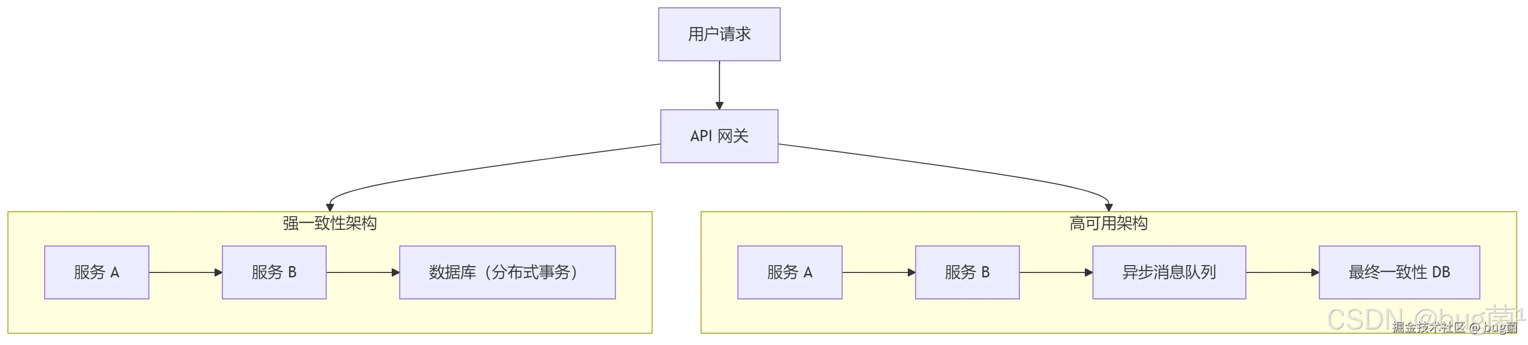 ✅ 架构图说明:左边是串行+事务确保强一致,右边使用异步/消息驱动提高可用性。
