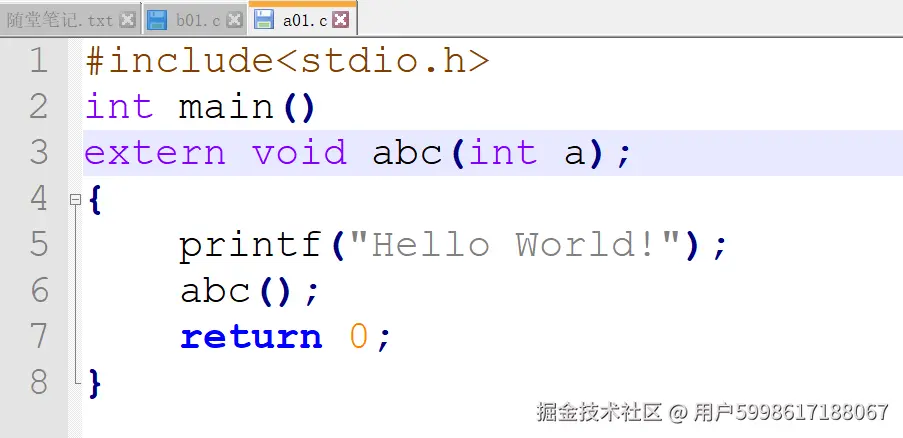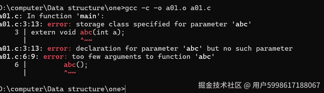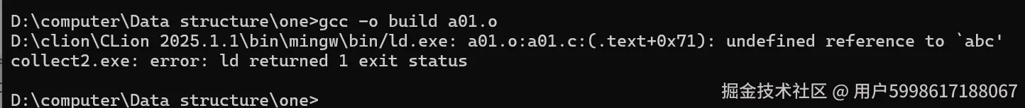 但是呢它也没有报错,为啥呢,因为c语言认为abc();是一个函数,但是呢我函数现在没有首地址但是呢,没有事,等到时候所以目标文件(.o)合在一起的时候,在来确定它的首地址
