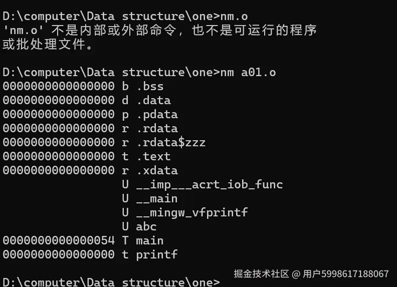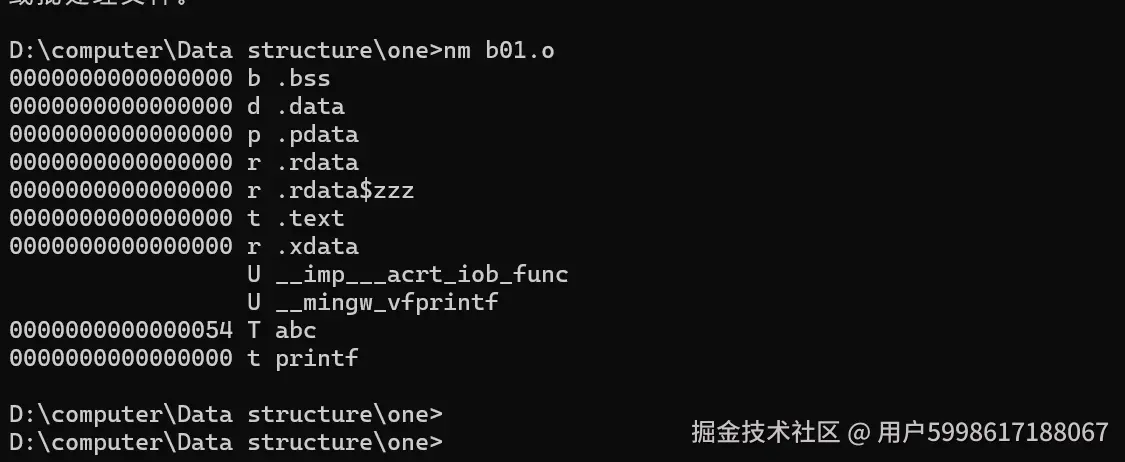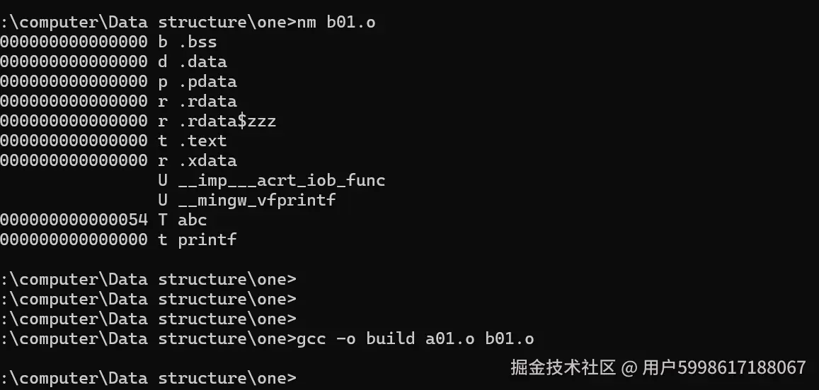 生成一个新的 .o ,然后看一下这是b01.o的nm,可以看到abc已经是实现