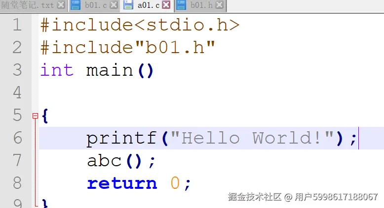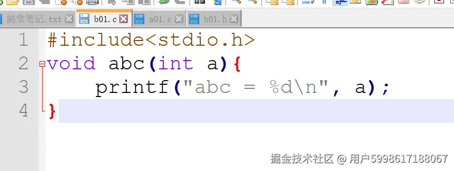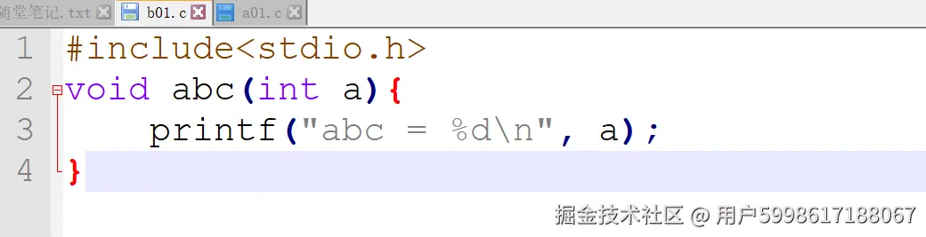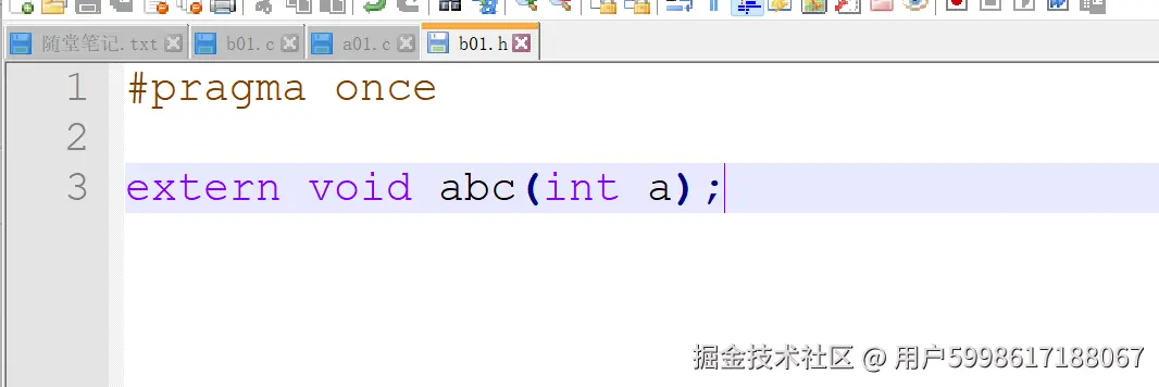 编译器说什么呢,它说too few,按它的说法abc();这里应该还有一个int a,这说明我们加了一个extern之后我们的编译器就知道了这个错误,但是声明呢也出现问题了,这个函数是b01文件实现的,a01文件如何知道并且加上extern呢,这个时候c语言就提出了头文件的概念,头文件目的就是在一开始就告诉编译器,我从一开始就做了那些准备工作,那我们就建一个头文件b01.h,因为呢这个函数是b01写的,那么这个接口也就是头文件就应该让b01来维护,因为c语言只编.c文件,所以我们除了a01.c文件要加头文件之外,b01.c也要加头文件