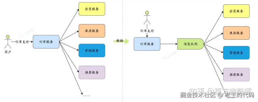 - 解耦:引入消息队列之前,下单完成之后,需要订单服务去调用库存服务减库存,调用营销服务加营销数据……引入消息队列之后,可以把订单完成的消息丢进队列里,下游服务自己去调用就行了,这样就完成了订单服务和其它服务的解耦合。
