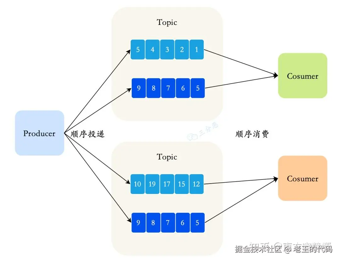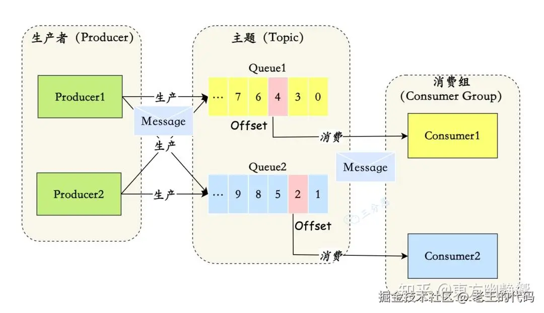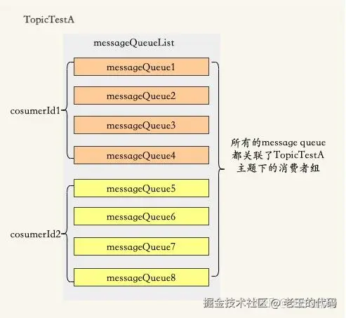 Message Queue(消息队列),一个 Topic 下可以设置多个消息队列,Topic 包括多个 Message Queue ,如果一个 Consumer 需要获取 Topic下所有的消息,就要遍历所有的 Message Queue。