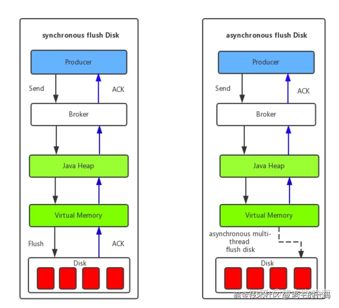 - 异步刷盘:异步刷盘是指消息达到Broker内存后就返回Producer数据已经发送成功,会唤醒一个线程去将数据持久化到CommitLog日志文件中。