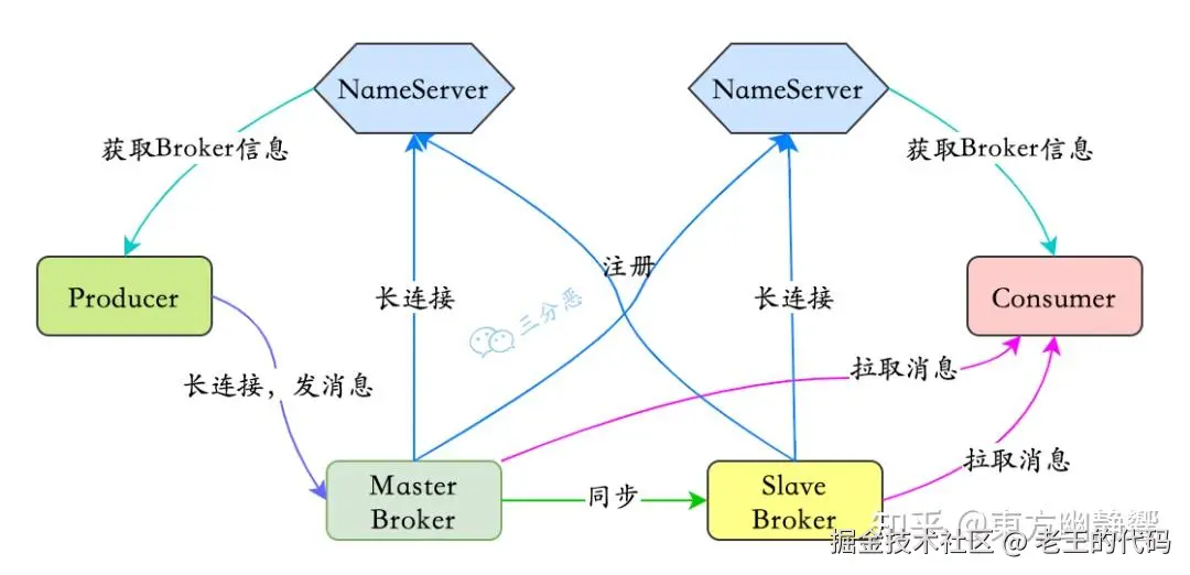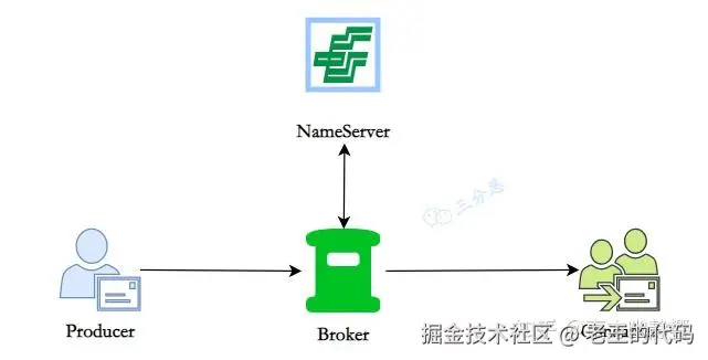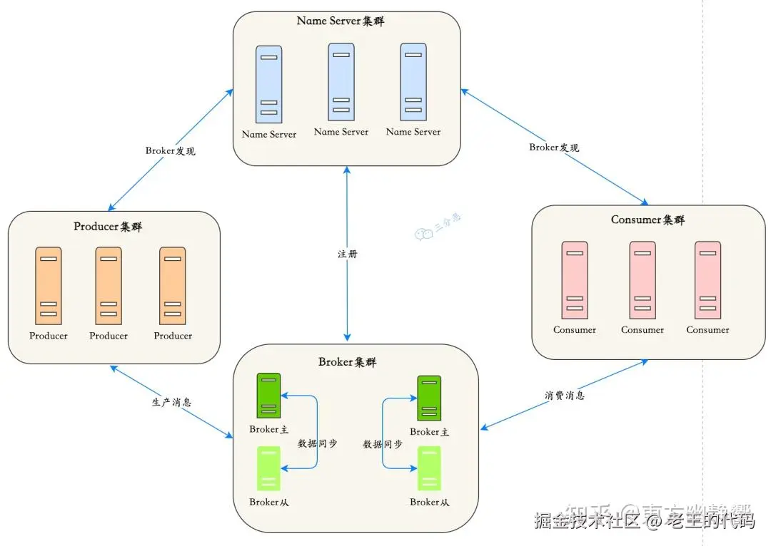 RocketMQ 一共有四个部分组成:NameServer,Broker,Producer 生产者,Consumer 消费者,它们对应了:发现、发、存、收,为了保证高可用,一般每一部分都是集群部署的。