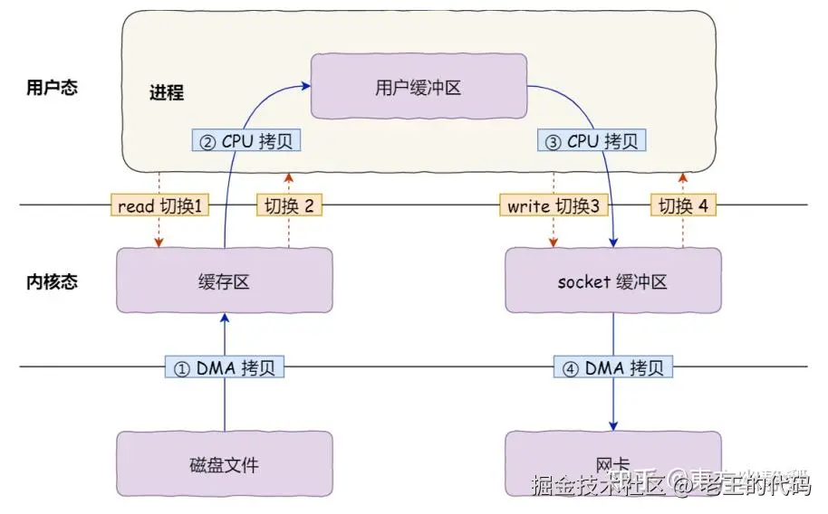 在操作系统中,使用传统的方式,数据需要经历几次拷贝,还要经历用户态/内核态切换。