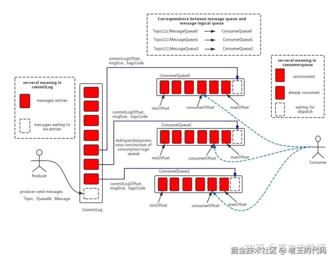 - Broker 内部维护着一个个 Consumer Queue,用来存储消息的索引,真正存储消息的地方是 CommitLog(日志文件)。