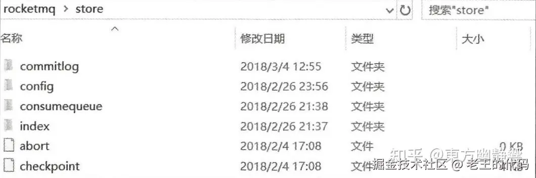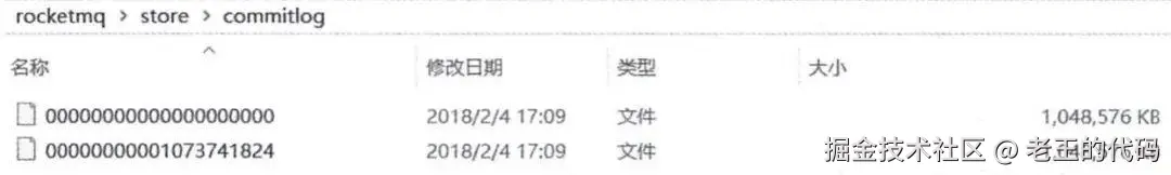 CommitLog文件保存于${Rocket_Home}/store/commitlog目录中,从图中我们可以明显看出来文件名的偏移量,每个文件默认1G,写满后自动生成一个新的文件。