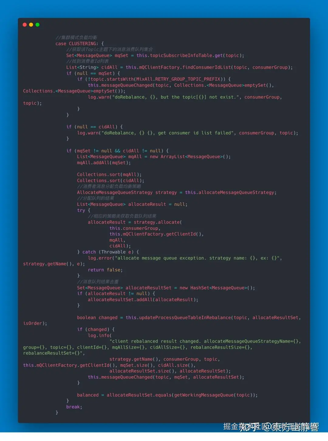 通过查看源码可以发现,RebalanceService线程的run()方法最终调用的是RebalanceImpl类的rebalanceByTopic()方法,这个方法是实现Consumer端负载均衡的核心。