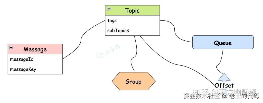 RocketMQ的消息模型中,这些就是比较关键的概念了。画张图总结一下: