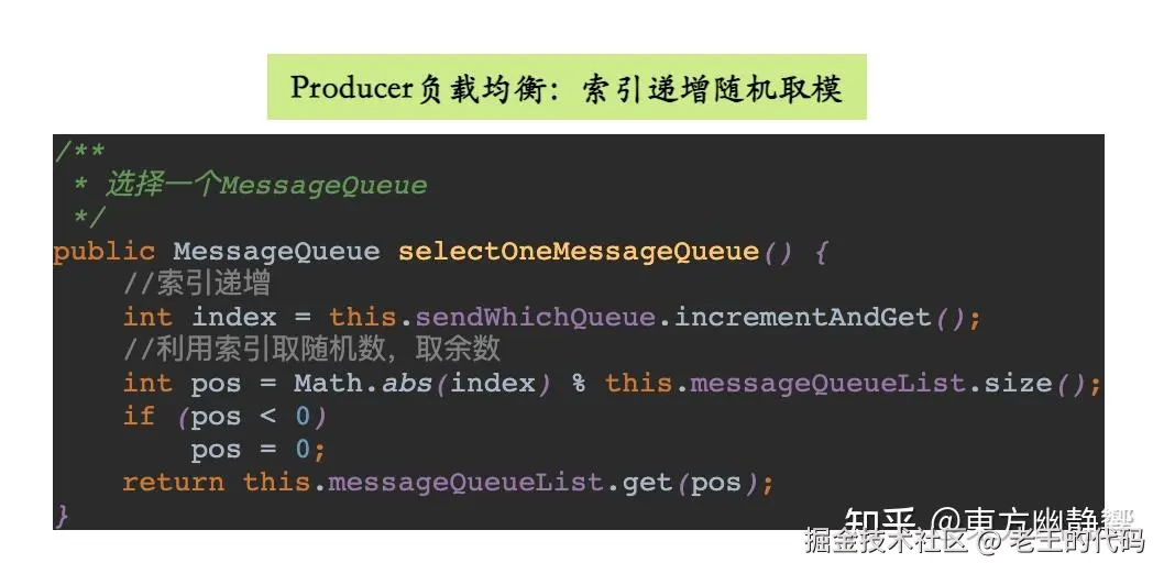 Producer端在发送消息的时候,会先根据Topic找到指定的TopicPublishInfo,在获取了TopicPublishInfo路由信息后,RocketMQ的客户端在默认方式下selectOneMessageQueue()方法会从TopicPublishInfo中的messageQueueList中选择一个队列(MessageQueue)进行发送消息。具这里有一个sendLatencyFaultEnable开关变量,如果开启,在随机递增取模的基础上,再过滤掉not available的Broker代理。