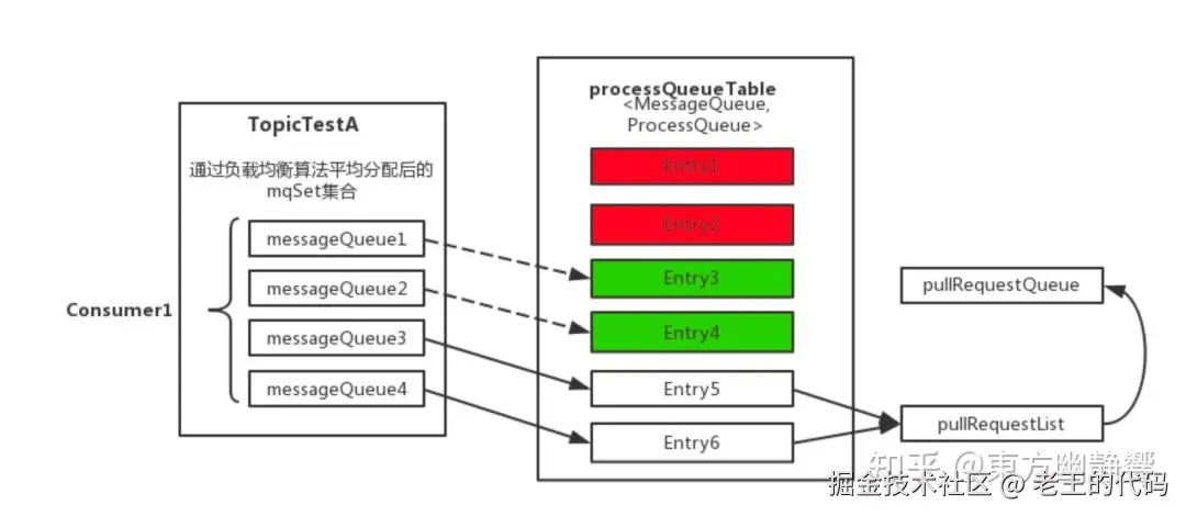消息消费队列在同一消费组不同消费者之间的负载均衡,其核心设计理念是在一个消息消费队列在同一时间只允许被同一消费组内的一个消费者消费,一个消息消费者能同时消费多个消息队列。