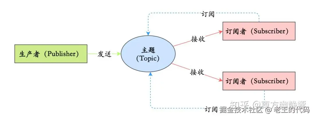 在发布 - 订阅模型中,消息的发送方称为发布者(Publisher),消息的接收方称为订阅者(Subscriber),服务端存放消息的容器称为主题(Topic)。发布者将消息发送到主题中,订阅者在接收消息之前需要先“订阅主题”。“订阅”在这里既是一个动作,同时还可以认为是主题在消费时的一个逻辑副本,每份订阅中,订阅者都可以接收到主题的所有消息。