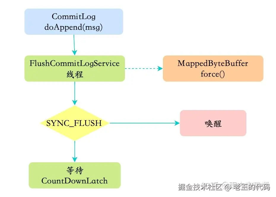 刷盘的最终实现都是使用NIO中的 MappedByteBuffer.force() 将映射区的数据写入到磁盘,如果是同步刷盘的话,在Broker把消息写到CommitLog映射区后,就会等待写入完成。