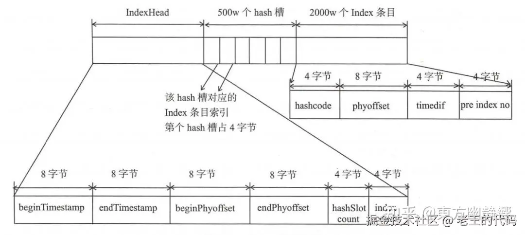 - IndexFile:IndexFile(索引文件)提供了一种可以通过key或时间区间来查询消息的方法。Index文件的存储位置是:{fileName},文件名fileName是以创建时的时间戳命名的,固定的单个IndexFile文件大小约为400M,一个IndexFile可以保存 2000W个索引,IndexFile的底层存储设计为在文件系统中实现HashMap结构,故RocketMQ的索引文件其底层实现为hash索引。