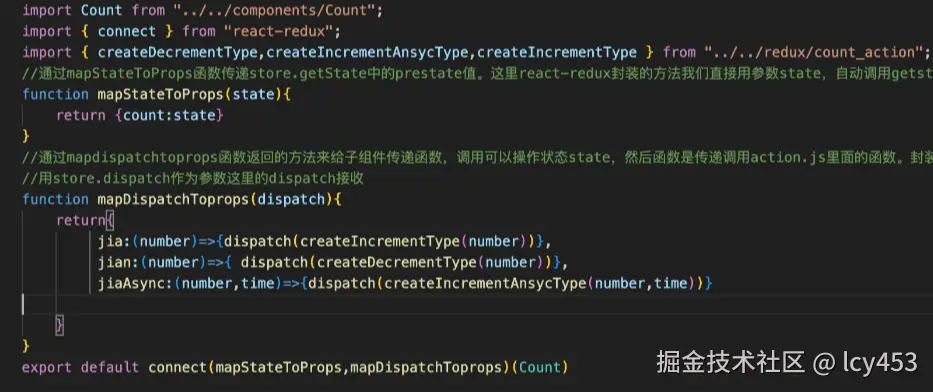 这里第一个函数参数是封装的react-redux自动给我们执行store.getstate()放这里下面的dispatch同理。然后我们在这里设置了状态以及方法,都是key value的写法。我们传props给子组件