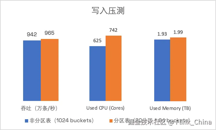 我们基于淘宝真实业务数据,对多级分区表的写入与读取性能进行了系统性压测,验证了分区裁剪能力的实际效果。测试对比了非分区表与分区表(共自动创建 20 个分区)在流式写入场景下的吞吐表现。结果显示:两者在写入吞吐和资源消耗上差异极小。表明多级分区与动态分区创建机制并未对写入性能造成明显影响。