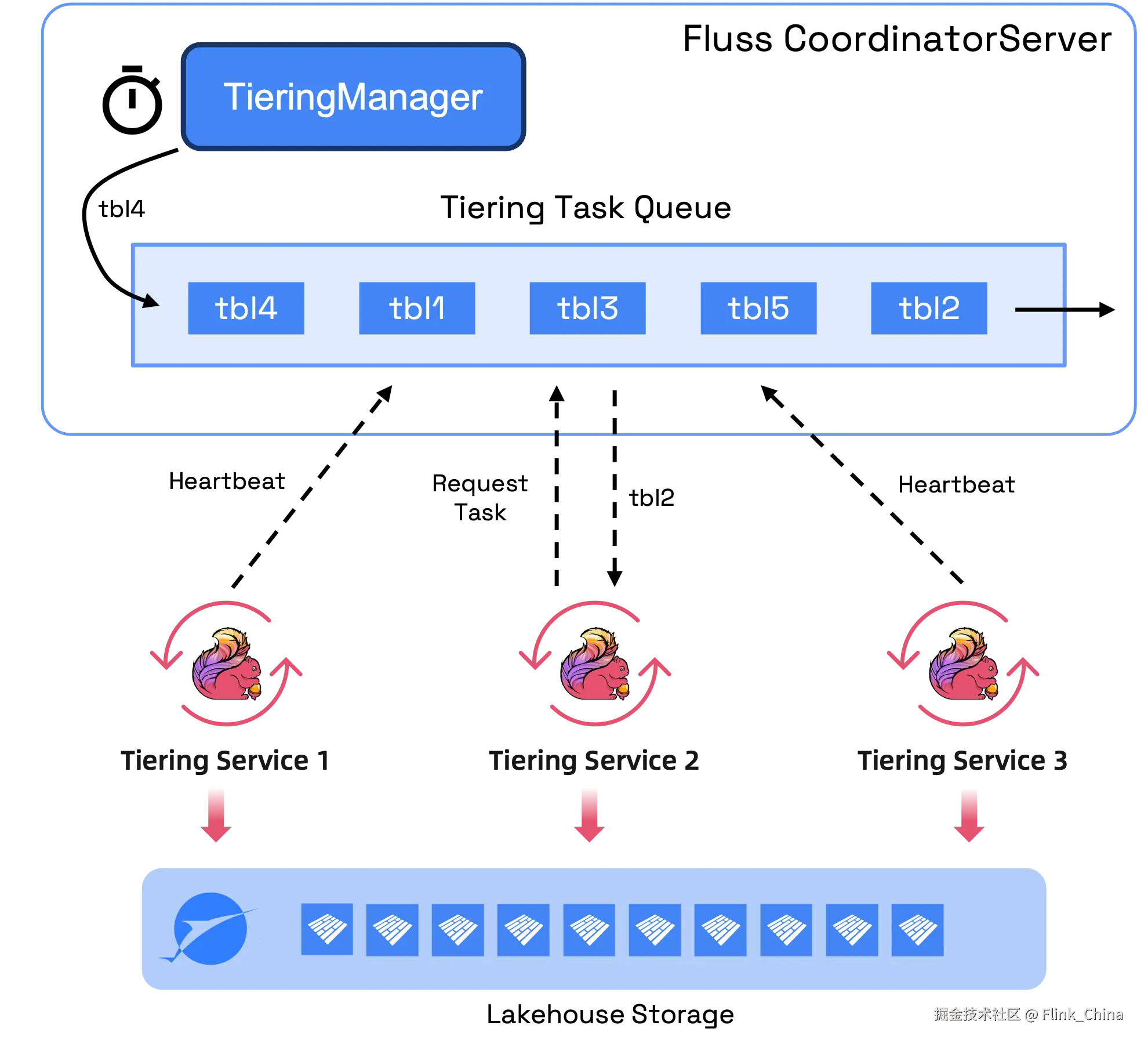 为了解决上述问题,我们在 Fluss 0.7 将入湖服务重构升级成了一个弹性无状态服务。在设计上,一方面是无状态化,不再使用 Flink State 存储同步位点,而是将位点信息持久化在 Fluss 元数据中,并计划在下一版本中持久化到 Paimon v1.2 引入的快照属性中。另一方面是微批处理模型,Flink 作业不再持续订阅所有表,而是每次只处理一张表,处理完成后再主动请求下一个待同步的表,这有效降低 Fluss 端的连接压力和资源消耗,同时提升了攒批效率和吞吐表现。