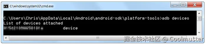 - 在弹出的窗口中输入命令: *adb devices, *检查电脑是否识别到你的设备。