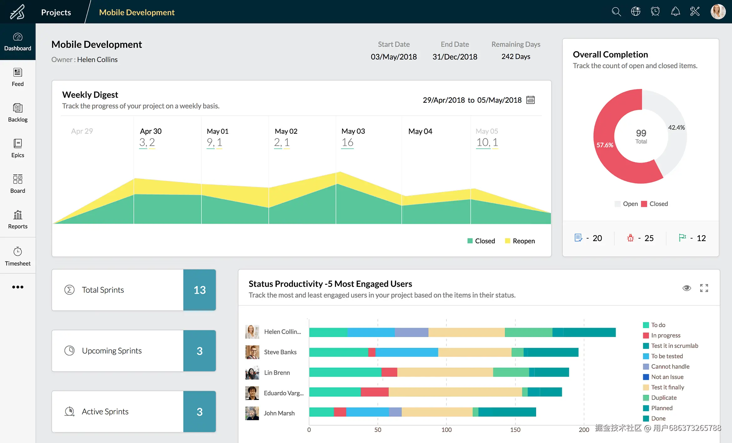 - 适用场景:50 人以下预算敏感的技术团队。这类团队注重工具的性价比和基础敏捷管理功能,Zoho Sprints 能以较低成本提供实用的解决方案。