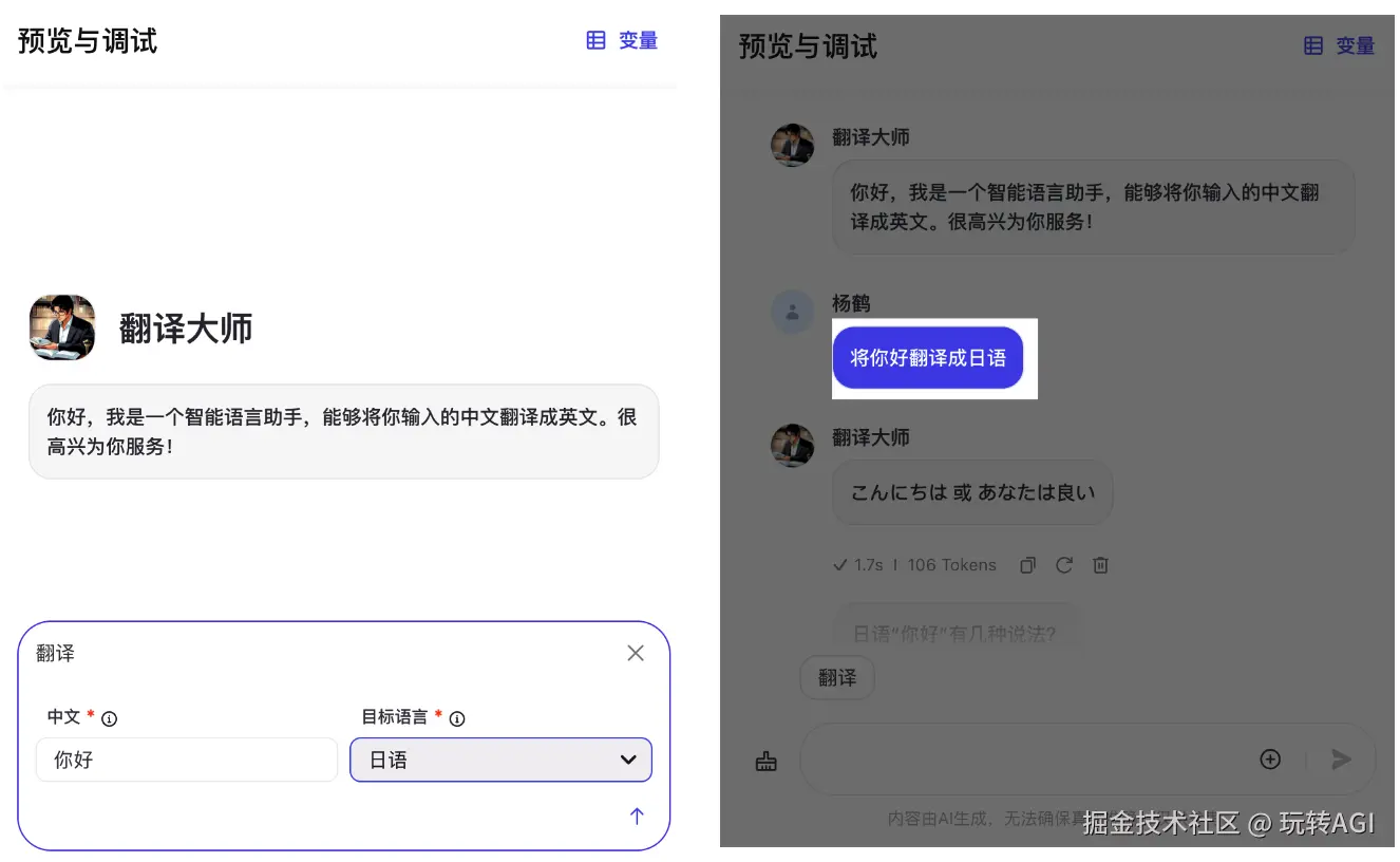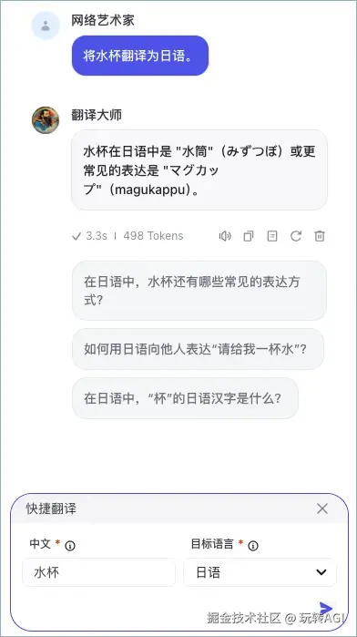 例如在翻译智能体中增加一个快捷指令,即原文输入框和目标语言列表,对话时你只需输入待翻译的内容和语言即可快速下发一条翻译指令。