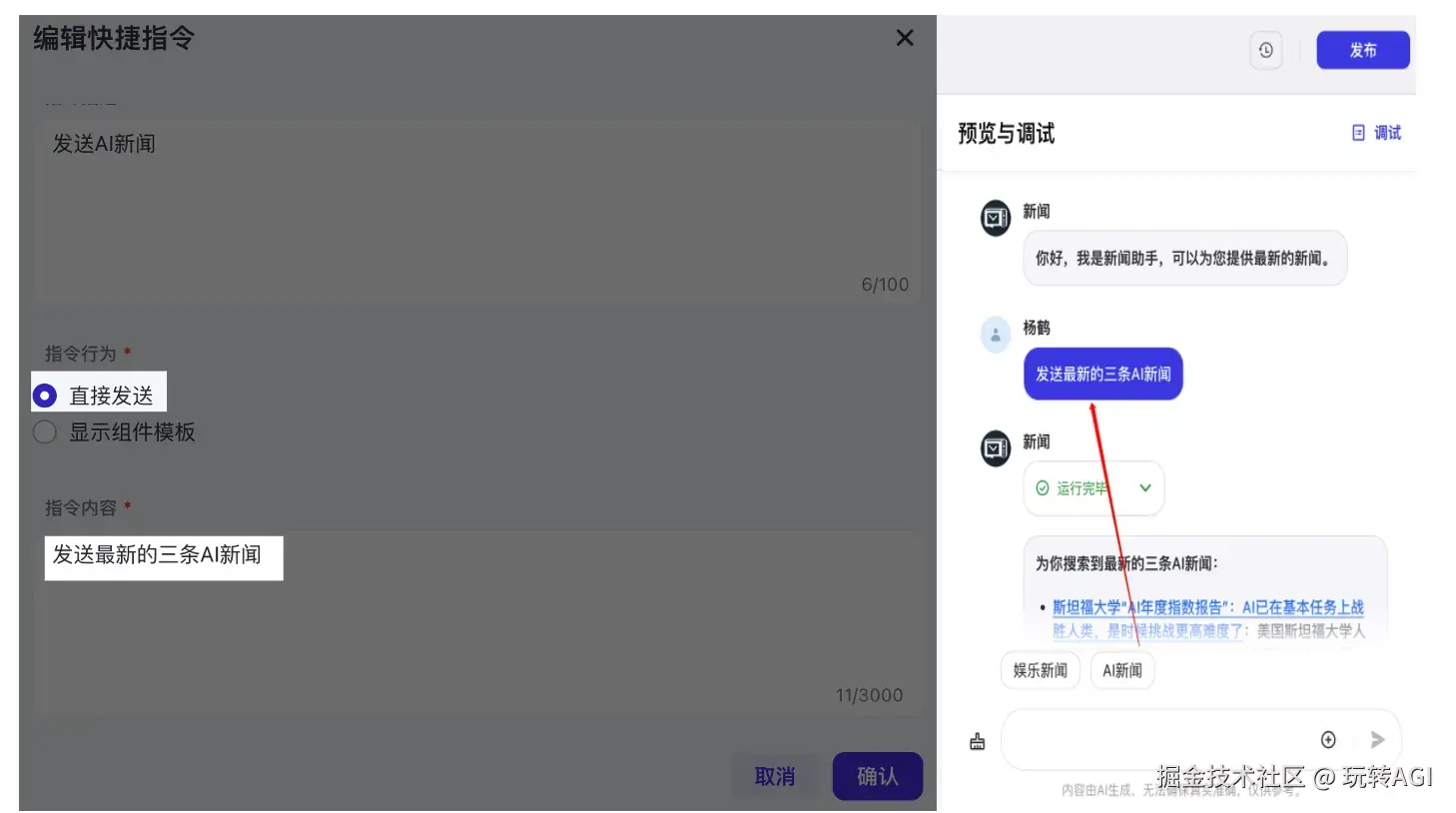 - 如下图所示(左侧是快捷指令配置截图,右侧是调试截图),当点击AI新闻指令时,会自动发送配置好的指令内容。