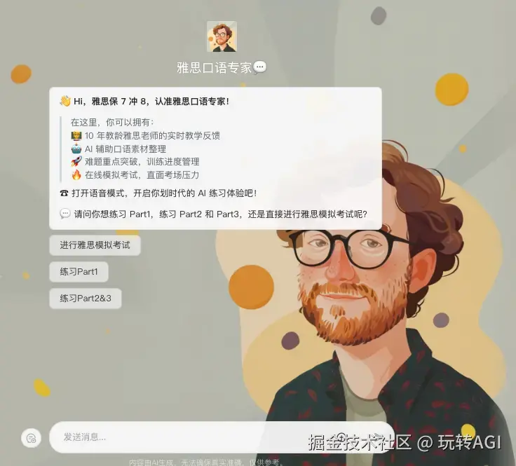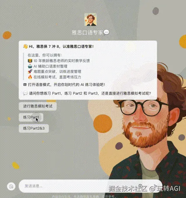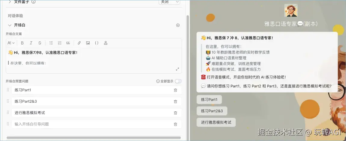 以雅思口语专家智能体为例,同时设置开场白文案和预置问题。