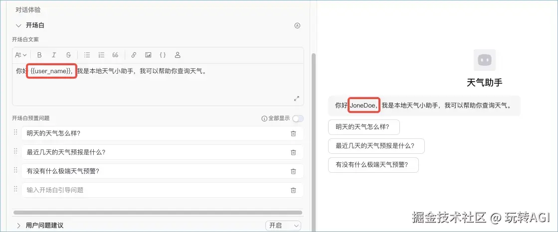 通过 Markdown 编辑器,你可以调整开场白文案样式,例如设置层级、加粗、斜体、删除线等样式效果。也可以添加链接、图片、代码块和 {{user_name}} 变量。其中,{{user_name}} 会自动引用扣子用户的昵称。