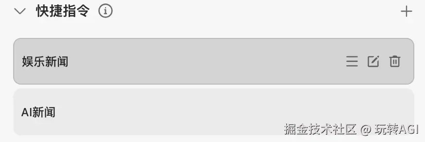 | 指令内容 | 输入用户点击该指令时发送的内容。例如:发送最新的三条 AI 新闻。 |