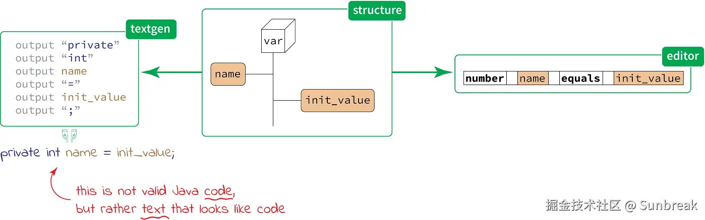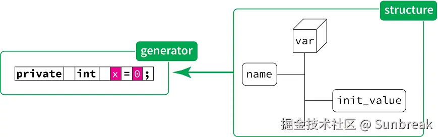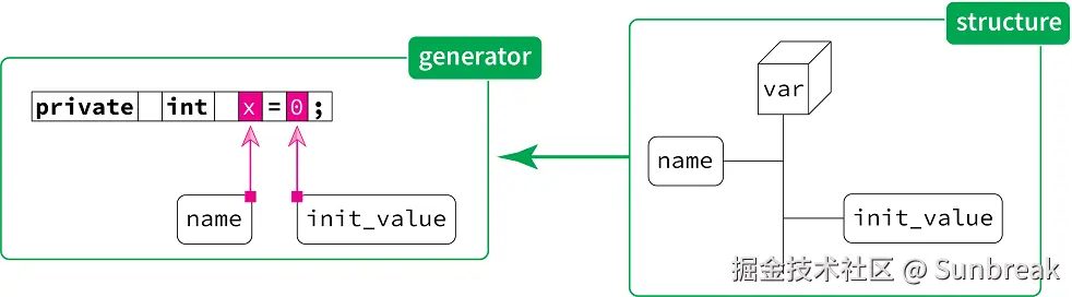 这本质上是一种字符串插值(或者如果你愿意的话,可以称之为模板表达式):我们有一些“固定”的部分(例如,**private int**)以及一些可变的部分(name属性的值以及init_value的值)。