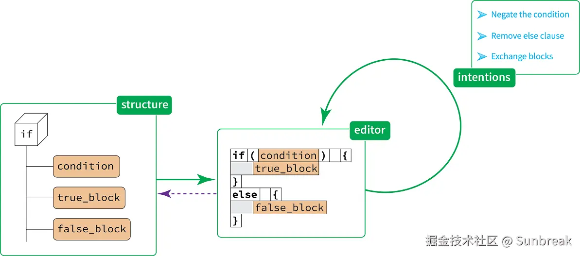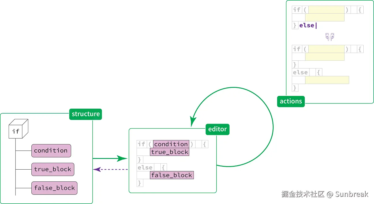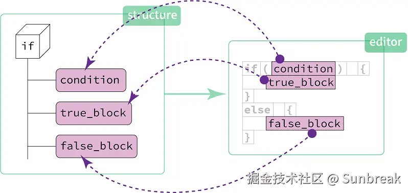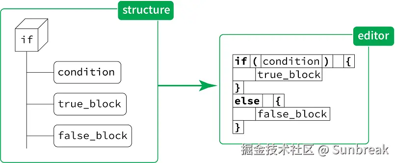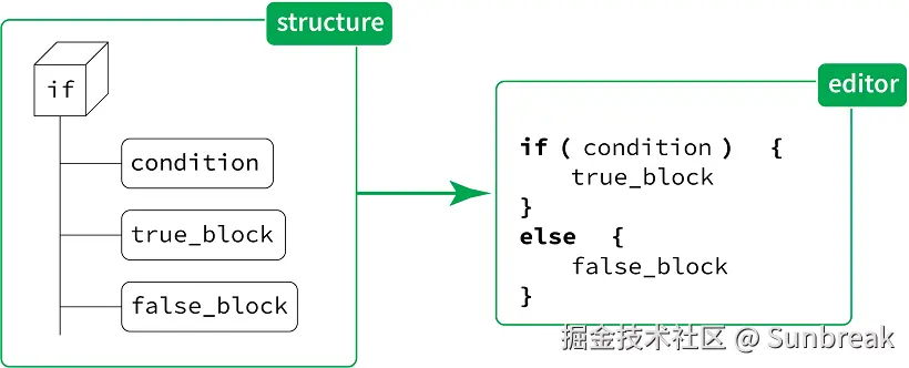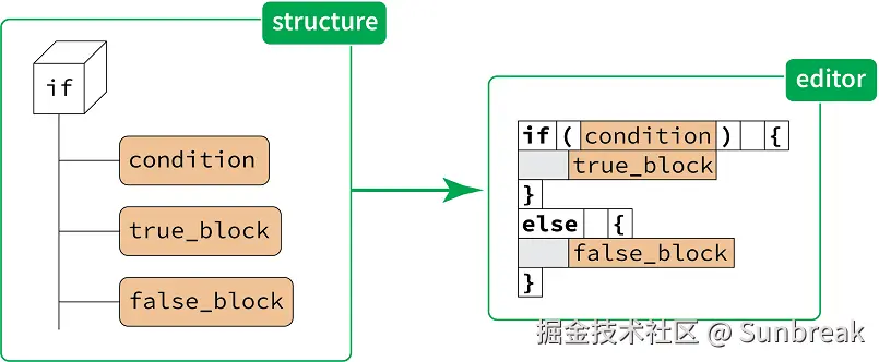 当程序员编写或修改一个 if 语句时,他们实际上是在改变其对应概念的结构。这种操作会从编辑器向结构产生“反馈”。关键词、括号和缩进是无法被修改的——即使可以修改,也没有什么实际意义。