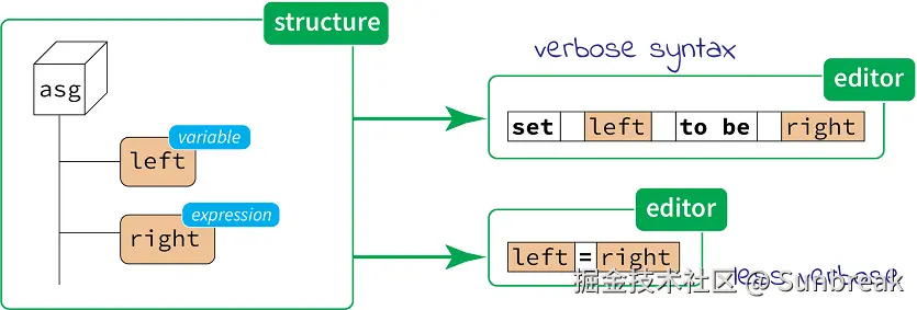 - 结构(Structure):是语言开发者的核心部分,辅以 行为(Behaviour)、约束(Constraints) 和 类型系统(TypeSystem)。