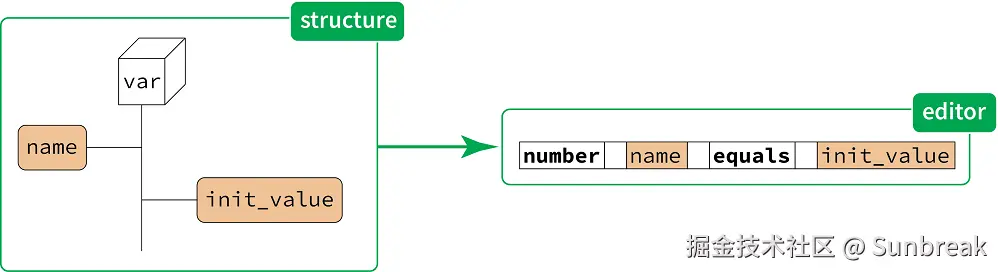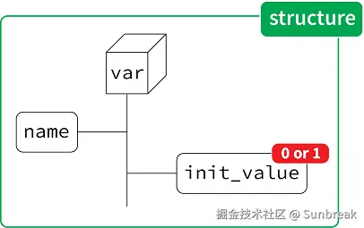 实际上,name是一个概念的属性(property),而init_value是一个概念的子元素(child)。它们之间的区别如下:从某种意义上来说,初始化表达式是“嵌入”在变量声明中的,它是一个不同的概念(即概念“expression”),由我们从“变量声明”概念的定义里“调用”。另一方面,变量的名称是变量“拥有”的某种东西。因此,我们分别有了 子元素(children) 和 属性(properties) 这两个概念。