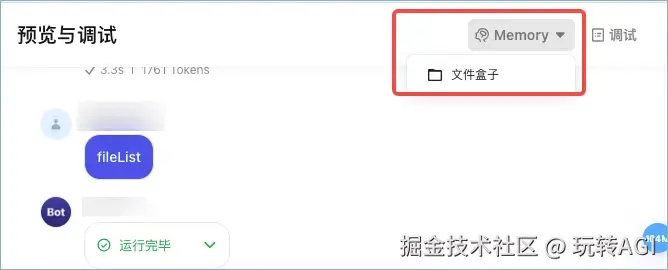 - 在智能体编排页面的预览与调试区域,展开 Memory > 文件盒子。