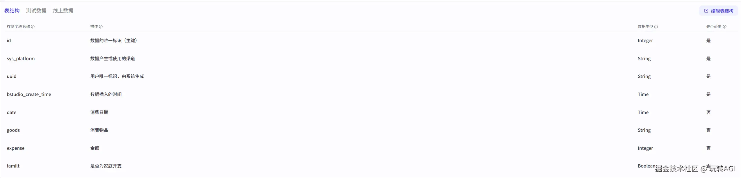 扣子支持在 Prompt 通过 NL2SQL 方式对数据表进行操作。为了方便演示和介绍数据功能,本文以一个记录日常开支的智能体为例。这个智能体中使用的数据表结构如下。