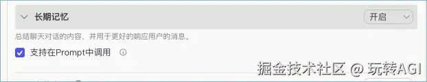 功能开启后,你还可以设置是否支持在 Prompt 中调用长期记忆。关于两种使用方式的说明,可以查看召回长期记忆。