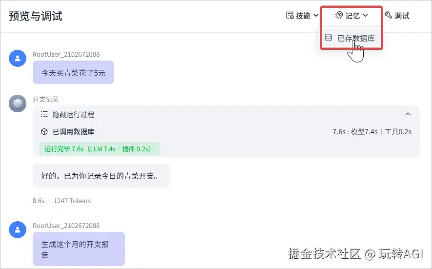 用户可通过自然语言与智能体进行交互来插入或查询数据库中的数据。智能体会根据用户的输入自动创建一条新的记录并将其存储在数据库中。同样,用户也可以使用自然语言查询数据库中的数据,例如询问某一天的总开支、某一个类别的开支等,智能体会根据用户的查询条件从数据库中检索相应的数据并返回给用户。