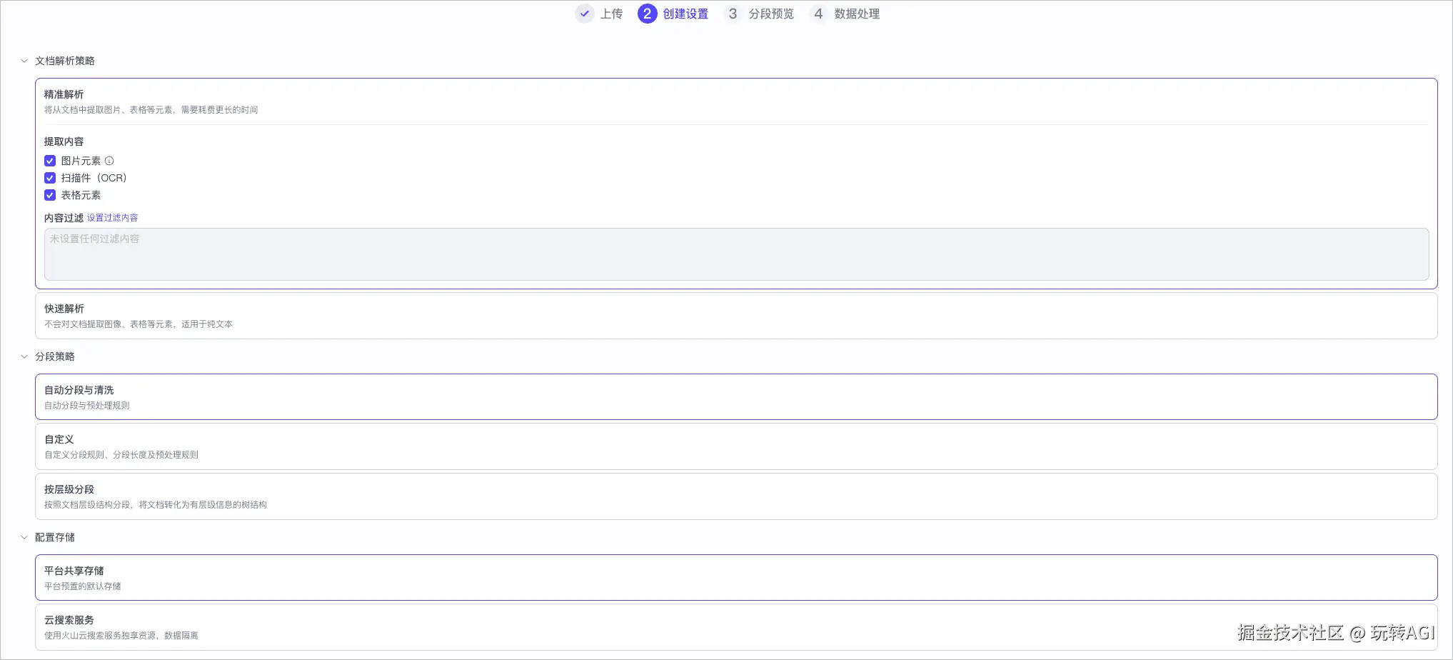 | 文档解析策略配置 | 上传本地文档时,需在创建设置页面,配置文档解析策略,支持精准解析和快速解析: + 精准解析:支持从文档中提取图片元素、扫描件(OCR)、表格元素;支持设置过滤策略,以文档页的粒度过滤掉当前文档中不需要导入的内容。精准解析需要耗时更长的时间。 + 快速解析:不支持从文档中提取图像、表格等元素,适用于纯文本。 | |