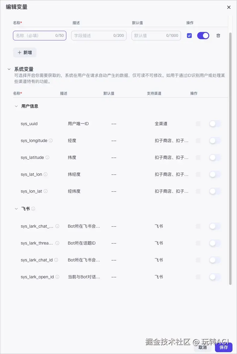变量是由智能体开发者创建的,智能体仅记录开发者定义过的变量。而长期记忆是智能体从对话中自动提取、总结、并且不断调整和积累的用户信息,是更为个性化的内容。