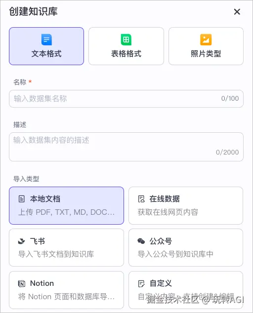 扣子支持从本地文档、在线数据、飞书、微信公众号、Notion、自定义等渠道上传文本内容到知识库。不同导入类型,对应的配置有所不同,详细说明如下: