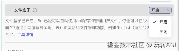 在智能体编排页面的记忆 > 文件盒子区域,开启文件盒子能力。开启后,你可以在工具详情中查看文件盒子相关的 API 名称。